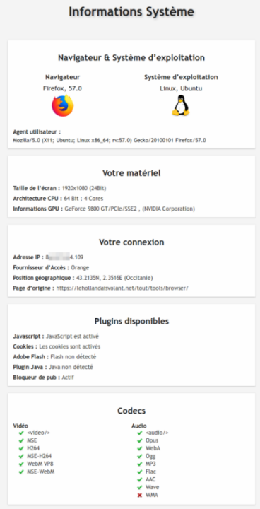 Notez au passage toutes les informations qui peuvent être collectées à votre insu, par le seul fait de se connecter à un site web (en cliquant sur « Informations détaillées sur votre IP »), en particulier sur votre navigateur et votre système d'exploitation.